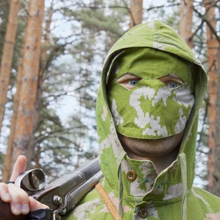 Photo of a male hunter face in panama hat and guillie forest camouflaged suit.