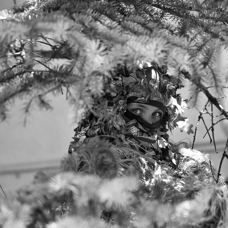 Young girl soldier defender with blue eyes face closed by mask in ghillie camouflage military ammunition with gun standing on background of spruce tree
