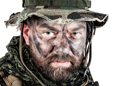 Special forces United States in Camouflage Uniforms studio shot. Wearing jungle hat, Shemagh scarf, painted face. Studio shot isolated