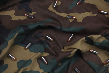 Many pistol bullets and cartridges on dark camouflage background. Concept of war action or hunting