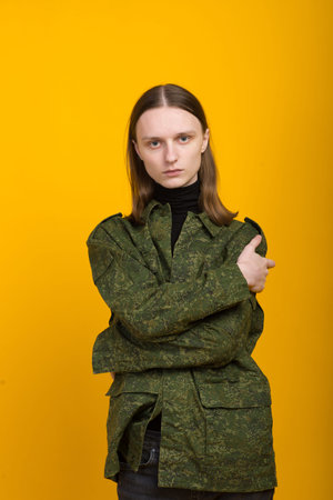 Androgen. Androgynous character on yellow background. Man or woman. Military style.