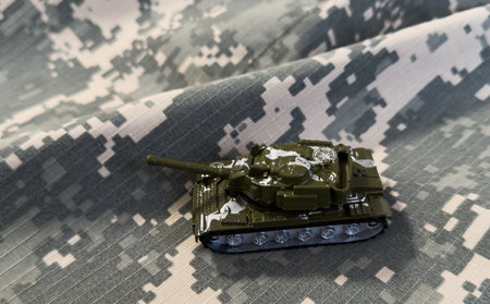 Camouflage toy tank on military background