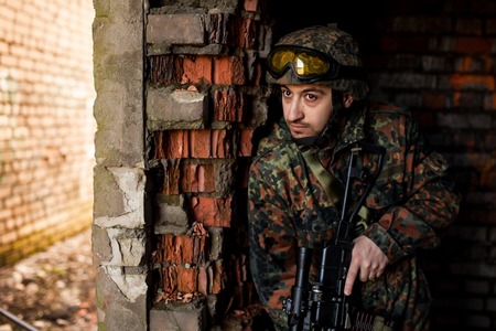 Young uniformed soldier with a gun ready to fire