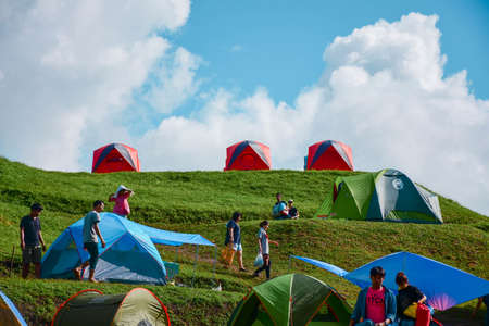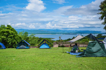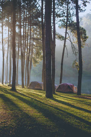 Camping and tenting under a pine forest at sunset in northern Thailand.