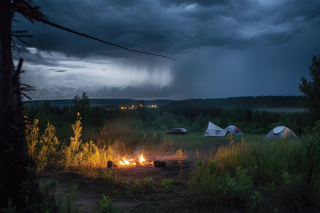 stormy night, with view of tent and campfire in the distance, created with generative ai