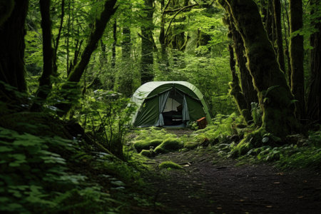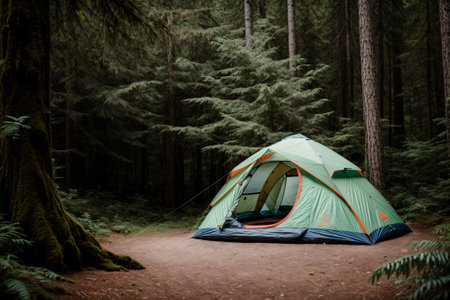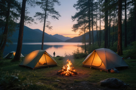 An outdoor camping scene showcases a tent set up in a dense forest. Warm tones of the tent and fire contrast with the cool greens of the trees. The image captures a sense of tranquility with soft lighting and hints of smoke. Suitable for illustrating travel, adventure, or leisure themes.
