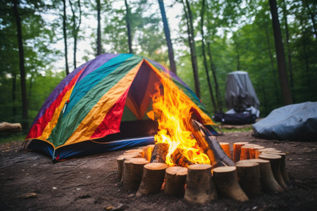 Bonfire in a forest setting, with camping gear around and a tent in the background. AI generative