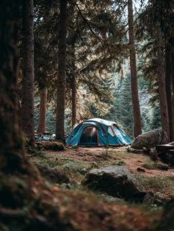 A tranquil campsite features a blue tent set amidst tall trees, rocky terrain, and fresh greenery, offering a perfect escape into natures beauty.