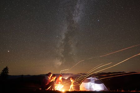 Night summer camping in mountains. Happy friends backpackers having a rest together around campfire near illuminated tourist tent. On background beautiful night starry sky full of stars and Milky way.