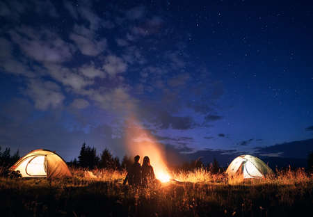 Fantastic view of night starry sky over grassy hill with illuminated camp tents, campfire and hikers. Young tourists having a rest near bonfire. Concept of hiking, night camping and relationship.