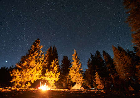 Cozy camping, lifestyle and adventure concept. Warm campfire and two rent in serene summer spruce forest setting. Bonfire from old branches. Flame of fire and smoke over fire