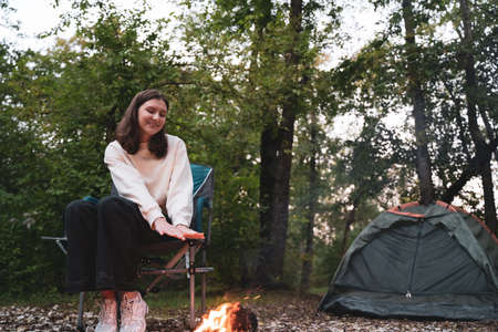 Lonely woman sits by the fire next to a tent in the woods. Rests and warms up on a hike. Twilight in nature