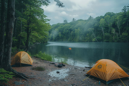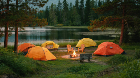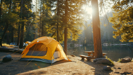 Camp site with tents by the lake and pine tree forest in morning sun light.