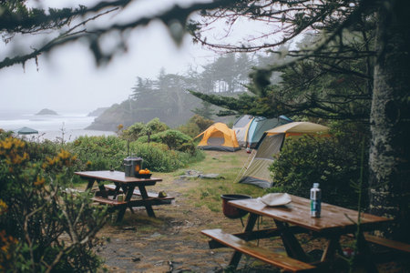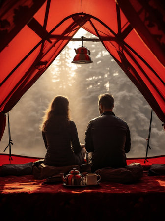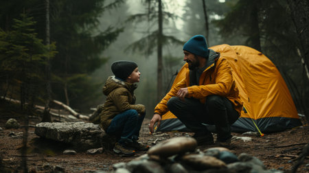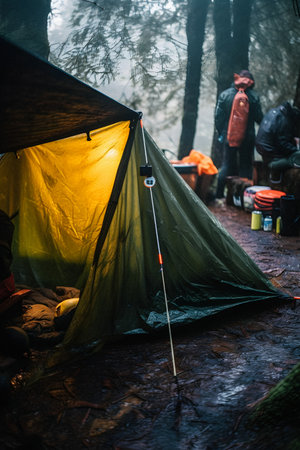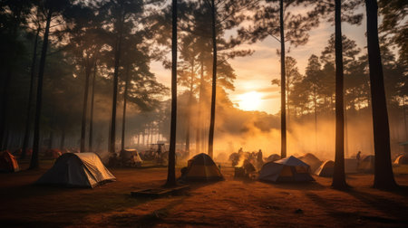 An outdoor camping scene showcases a tent and a small campfire. The image captures the warmth of fire against the backdrop of a dense forest. Mist and steam create an atmospheric effect. This image could be used for various purposes such as editorial, travel, or nature-related projects.