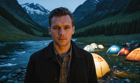 A solitary, warmly lit tent glows against the deep twilight sky, nestled in a serene mountain valley. Stars begin to emerge above the silhouetted peaks, evoking peace, adventure, and the quiet beauty of nature.
