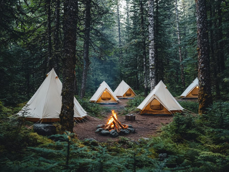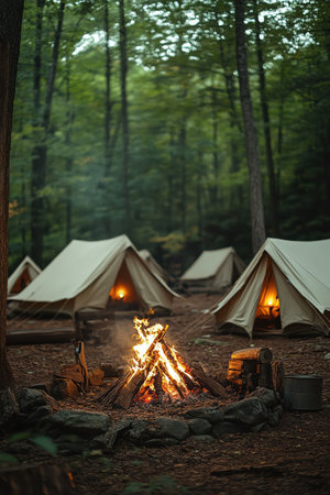 Campfire in the woods surrounded by canvas tents, peaceful and rustic atmosphere