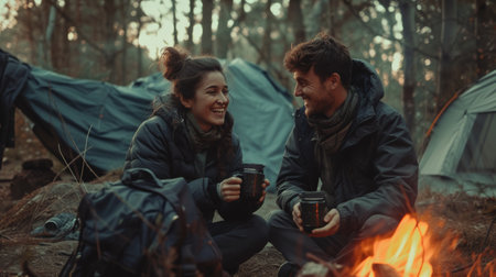 Couple sitting near campfire and drinking tea. Man and woman camping in forest.