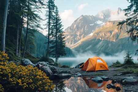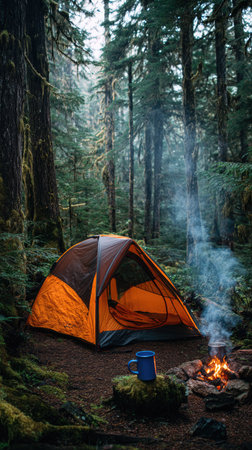 An orange camping tent sits near a campfire in a lush forest environment. The composition features tall trees and low hanging fog. The image displays a natural outdoor setting, with a focus on travel and adventure. Suitable for editorial and commercial use, related to travel and the outdoors.