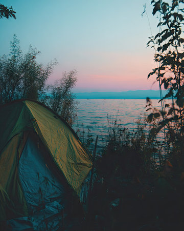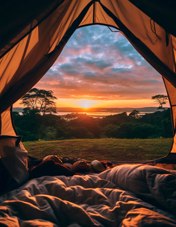A vibrant image depicts a view from inside a tent, framing a serene landscape. The scene showcases a lake with surrounding hills under a clear sky. The warm tones of the tent contrast with the cool blues and greens of the outdoor environment. This visual is suitable for travel, adventure, and outdoor lifestyle concepts.