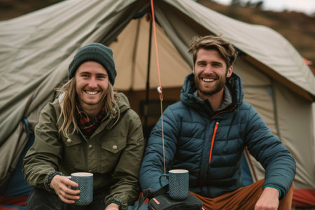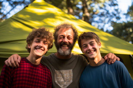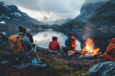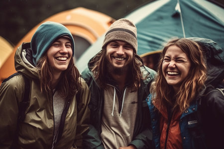 A group of cheerful backpackers captured candidly in their element at a lively campsite. AI Generative AI
