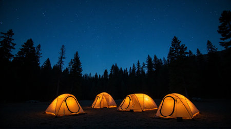 Cozy illuminated tents glow under a starry night sky, promising adventure and escape in nature's embrace