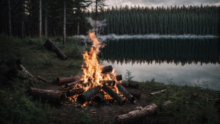 A scenic campsite with a roaring fire beside serene blue lake, Small campfire with gentle flames beside a lake during a glowing sunset, Ai generated
