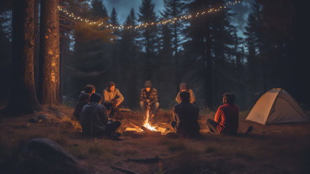 Camping in the forest at night. Group of friends sitting around the campfire.