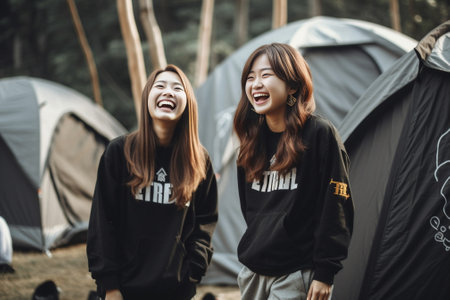 Generative AI : Three asian women laughing and smiling in park Group Of Friends Having Fun Together Outdoors Enjoy moment of friend during walking and camping together Lifestyle an