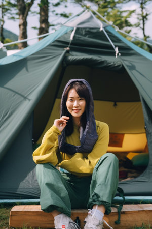Generative AI : Young smiling woman sitting near tent with laptop computer and working online in nature during camping adventure trip in forest happy female enjoying remote work at