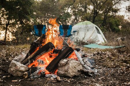 Beautiful bonfire near chairs and camping tent in forest with copy space