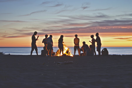 Group of People Sitting Around a Crackling Campfire in the Woods, Family and friends around a campfire, celebrating the end of a successful hiking trip, AI Generated