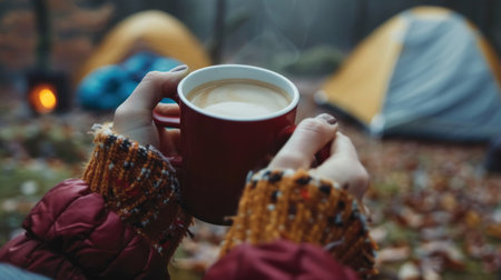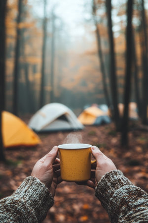 Hands cradle a warm cup, offering comfort amidst a blurred background of colorful tourist tents in a serene forest setting during a misty day.