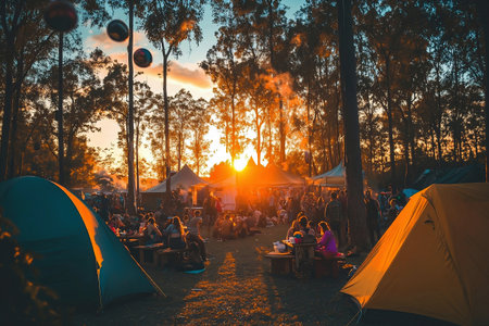 A lively campsite comes alive at night with glowing tents nestled among trees, and a central campfire creating a warm, inviting atmosphere for gathering and sharing stories.