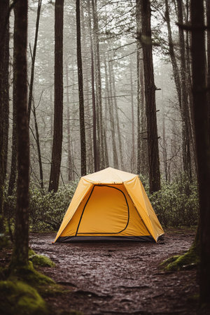 A solitary yellow tent set against a misty forest backdrop. The tent is positioned on a rocky path, surrounded by dense foliage.