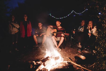 Friends travelers chilling at big bonfire, listening to acoustic music, relaxing at camp in the night forest. Group of people resting at fire in the evening, camping near lake