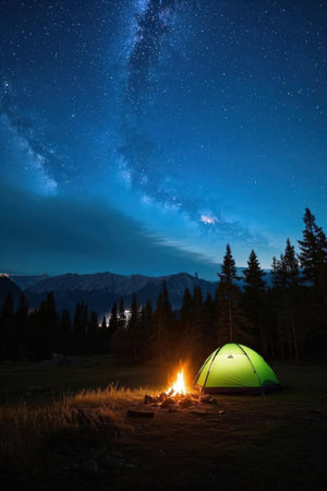 Experience a serene camping scene with tents illuminated by warm light, a cozy bonfire, and a breathtaking starry sky creating a magical atmosphere in nature.