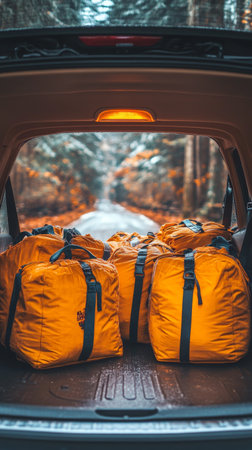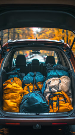 Efficiently packed car trunk with camping gear backpacks, storage bins, and outdoor supplies
