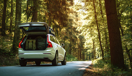 Close up of a white car on the road in the forest.