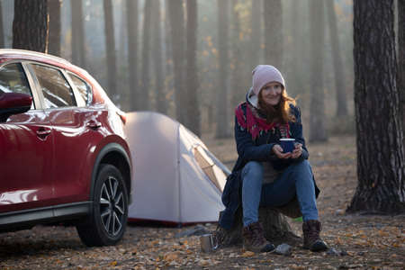 travel by car. girl tourist sits on a tree stump with a cup of tea and a car with a tent in the background