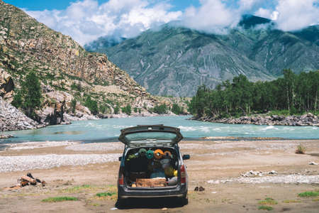 Car with open large trunk near mountain river with turquoise water. Tourists on vacation in mountains. Tourist things in car. Journey and active rest in highlands. Travel background.