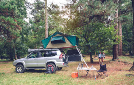 Off road adventure with a trendy 4x4 car in the forest. Offroad trip for a group of friends with camping tent on the roof Vintage cross-country vehicle Leisure adventurous open air holiday concept.