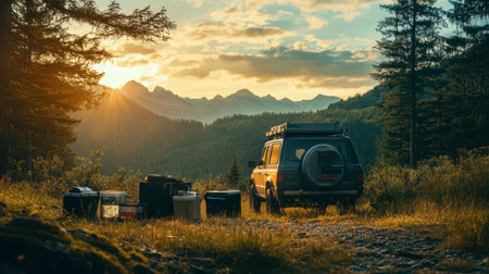 Camping tents and SUV car at mountain campsite on bright sunny evening. Active tourism and offroad concept