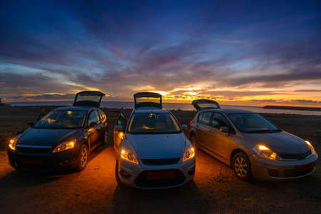 Three car with lighted headlamp on seaside. Beautiful sundown in background.