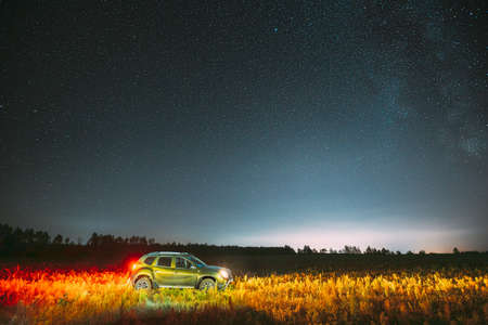 Milky Way Galaxy In Night Starry Sky With Glowing Stars Above Green Car SUV In Countryside Landscape. Milky Way Galaxy And Rural Field Meadow
