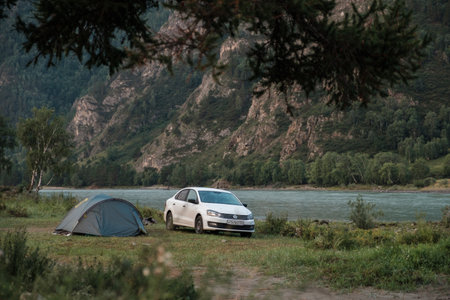 CHEMAL, RUSSIA - AUGUST 9 2022: The tent and the car stand on the bank of the river