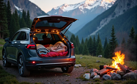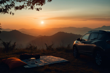 Blanket, pillow, and portable lamp next to a car parked on a hilltop, creating a cozy scene for watching a breathtaking mountain sunrise