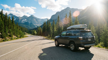 An SUV with a roof box is parked on the side of a winding road in a vast mountain range. The sun shines brightly over the evergreen forest, creating a beautiful lens flare.