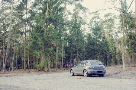 Old car with suitcases on car roof stands in clearing in forest