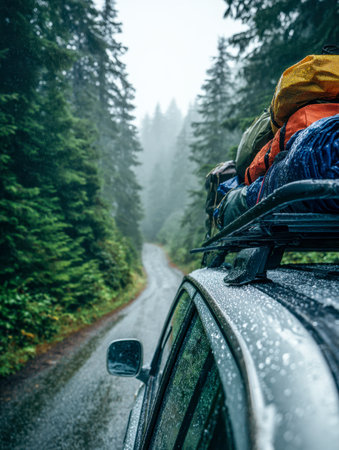 A winding mountain road cloaked in fog, reflections shimmering on wet pavement, inviting explorers into the tranquil embrace of nature's damp serenity.