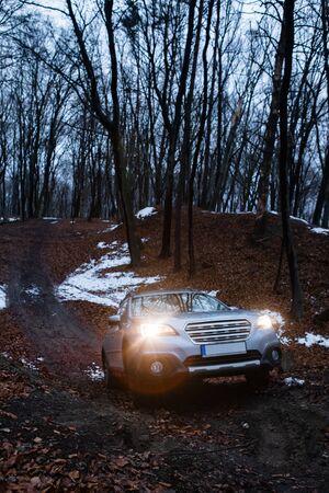 off road car travel at winter forest 4x4 vehicles